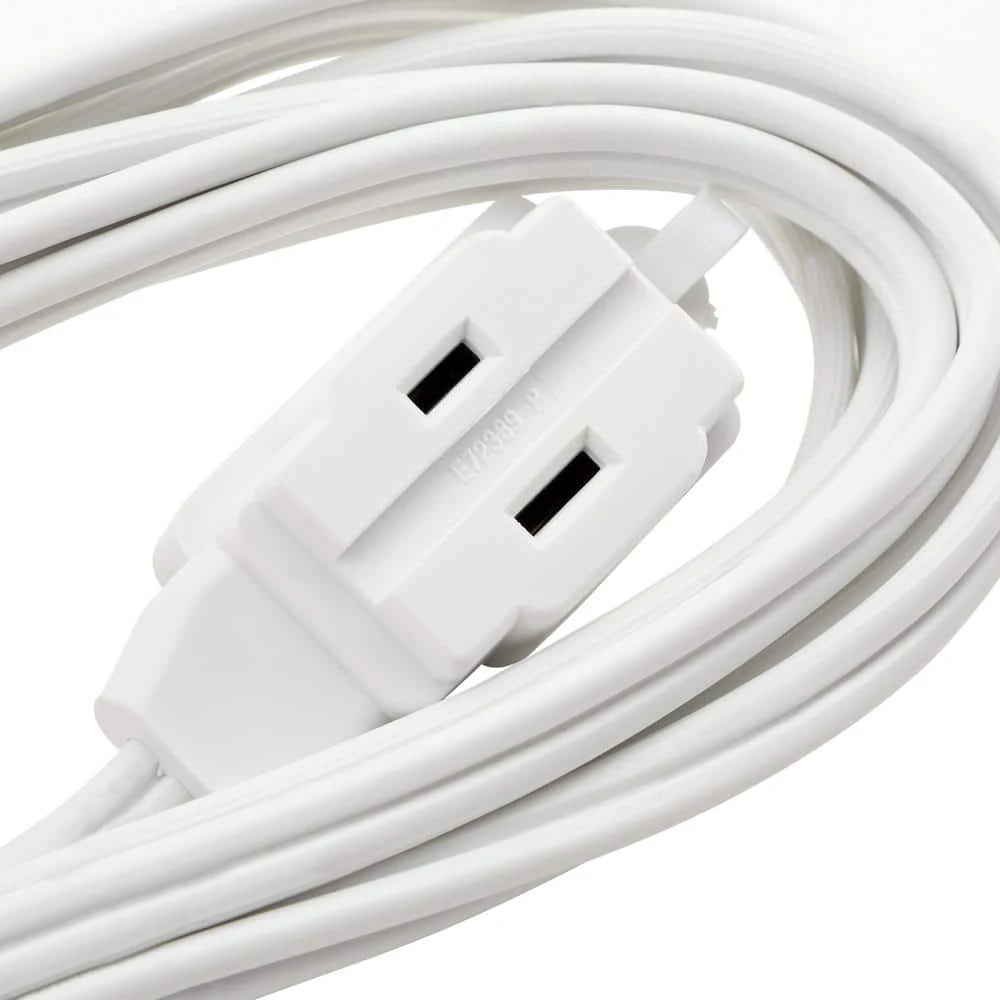 This 12 ft. White 16/2 SPT-2 Slender Plug Extension Cord is designed to let furniture be placed close to the wall. The cord has a cube tap and a polarized wire. Easily add 3 more outlets in your living space. Safety cover on outlet.