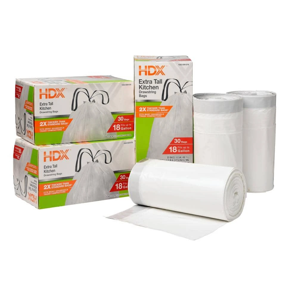 HDX Kitchen and Compactor WHT Drawstring Bags (90-Count) are made from a blend of high-performance polyethylene resin for strength and performance. Sized to fit most standard trash compactors, these durable bags are 2 mm thick to easily support pressure. Perfect for all your household trash needs, they feature a 1-at-a-time dispensing design for easy access.