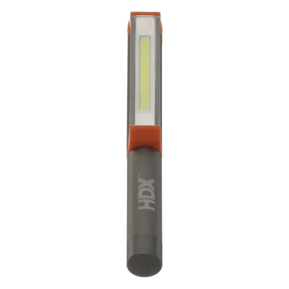 This HDX LED pen light features a high power cob LED. Made with heavy duty aluminum housing. Ideal for close up inspections. It can be gripped like a pen and also attached to a metallic surface thanks to its magnetic pocket clip.