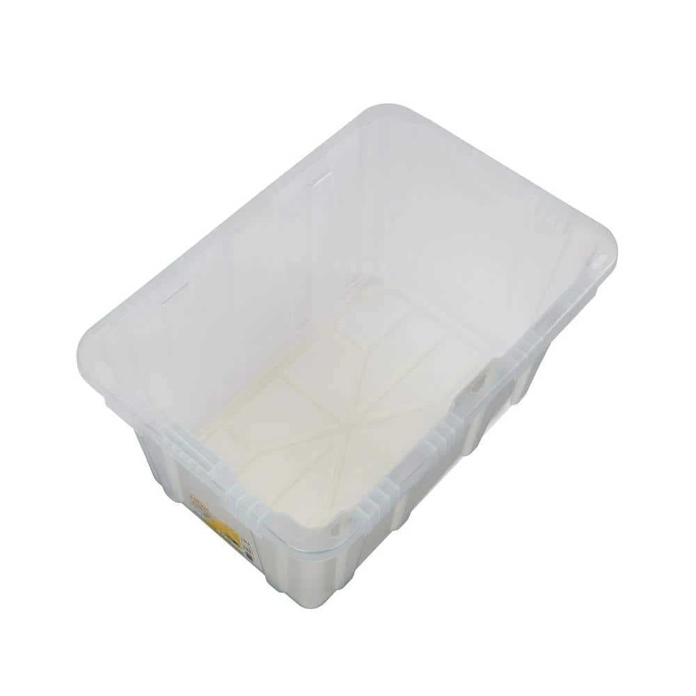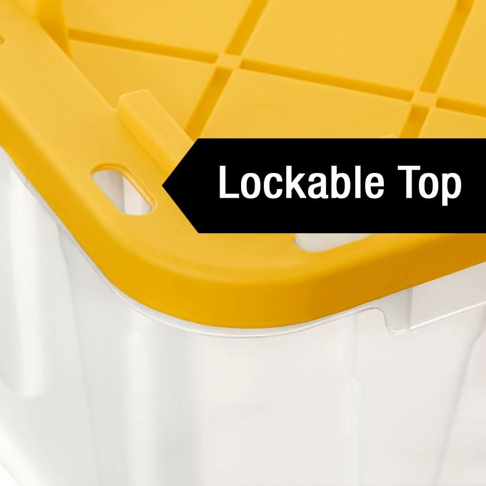 This HDX reinforced stackable 27 Gal. heavy-duty tough tote will handle any storage job ranging from general storage needs to extreme storage jobs. The tote includes a clarified polypropylene clear base and durable recycled polypropylene yellow reinforced snap-fit lid to secure and protect your valuables. This tote is a perfect option for the meticulous organizer who demands the very best in heavy-duty storage and protection. Integrated slots make the tote lockable to keep away unwanted intruders. This tote includes innovative tie-down channels that allow it to be easily strapped down for simple transportation and fits most Hitch Mounted Cargo Carriers.