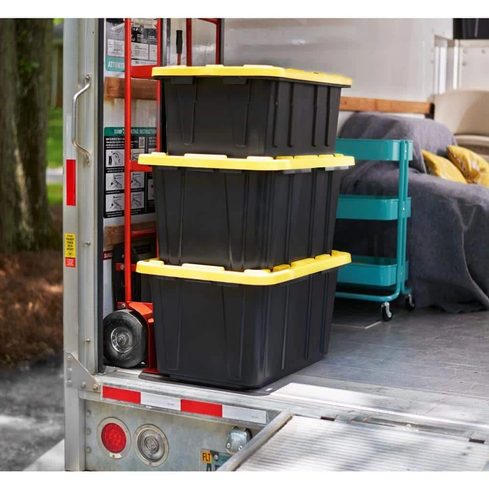 This HDX reinforced stackable 27 gallon heavy-duty tough tote will handle any storage job ranging from general storage needs to extreme storage jobs. The tote includes a black base made from durable recycled polypropylene and a yellow reinforced snap-fit lid to secure and protect your valuables. This tote is a perfect option for the meticulous organizer who demands the very best in heavy-duty storage and protection. Integrated slots make the tote lockable to keep away unwanted intruders. This tote includes innovative tie-down channels that allow it to be easily strapped down for simple transportation and fits most Hitch Mounted Cargo Carriers.