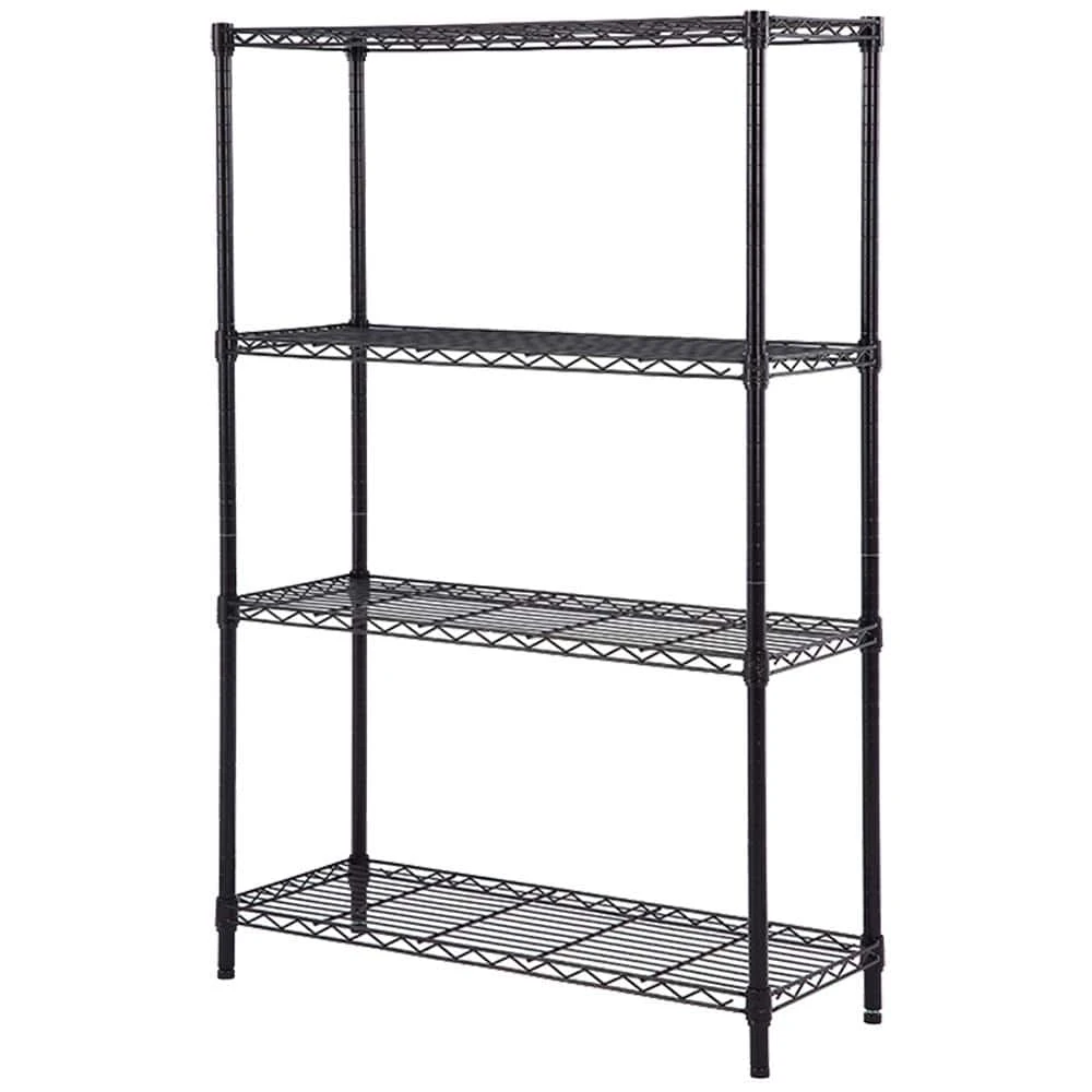 This easy-to-assemble 4-Shelf Decorative Wire Black Finish Shelving Unit. All shelf heights are easily adjustable and the unit can be assembled without any tools. Each shelf holds up to 350 lbs. when evenly distributed and features a total unit weight capacity of 1400 lbs. for optimal use in kitchens, pantries, utility rooms, warehouses and garages.