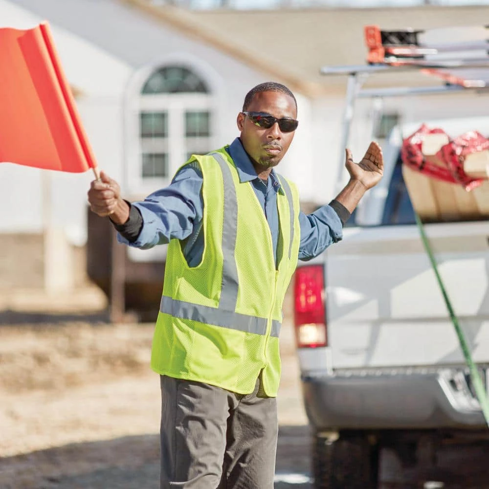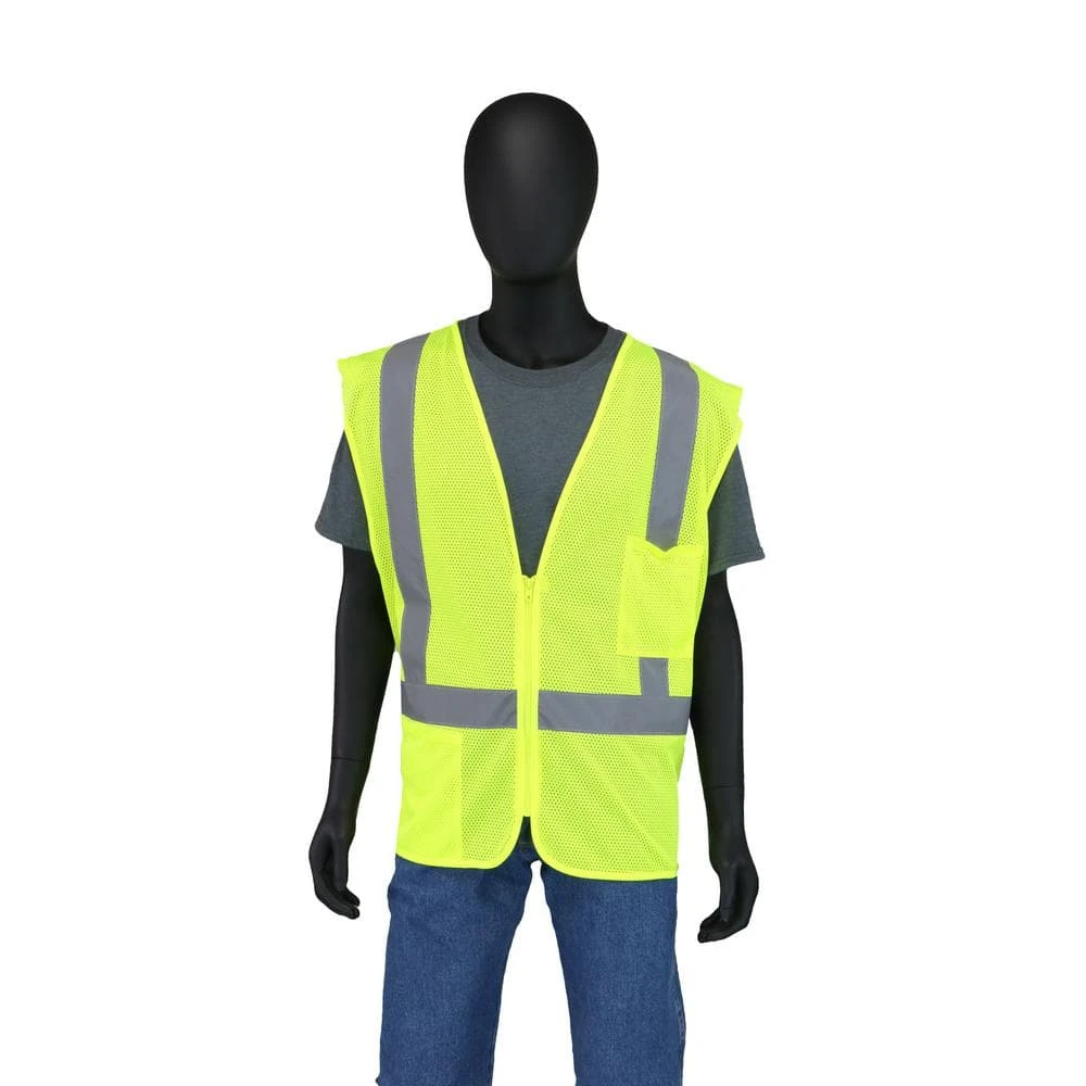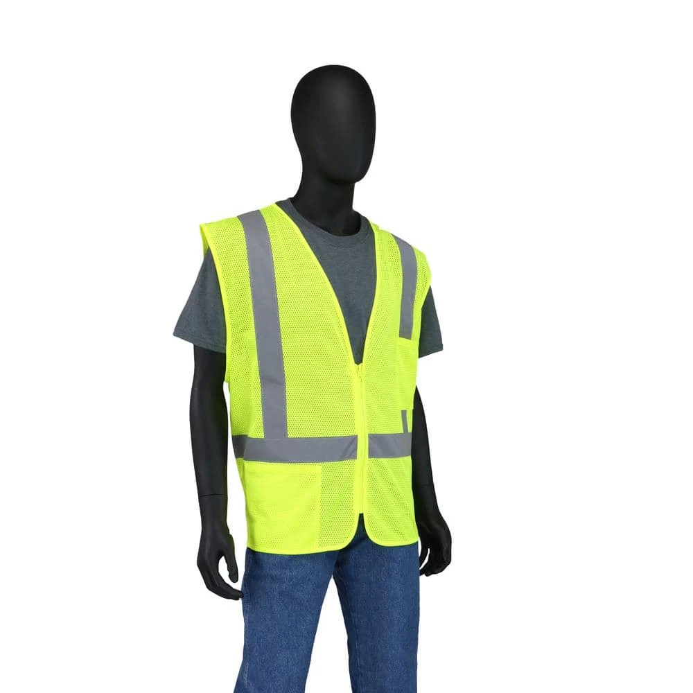 ANSI Class 2 Type R Hi-Viz Yellow mesh vest. This vest is equip with 2 in. H-Shaped silver reflective tape and made with breathable, lightweight mesh fabric. There is a zipper in the front for a secure closure, along with 1 interior and 1 exterior pocket.